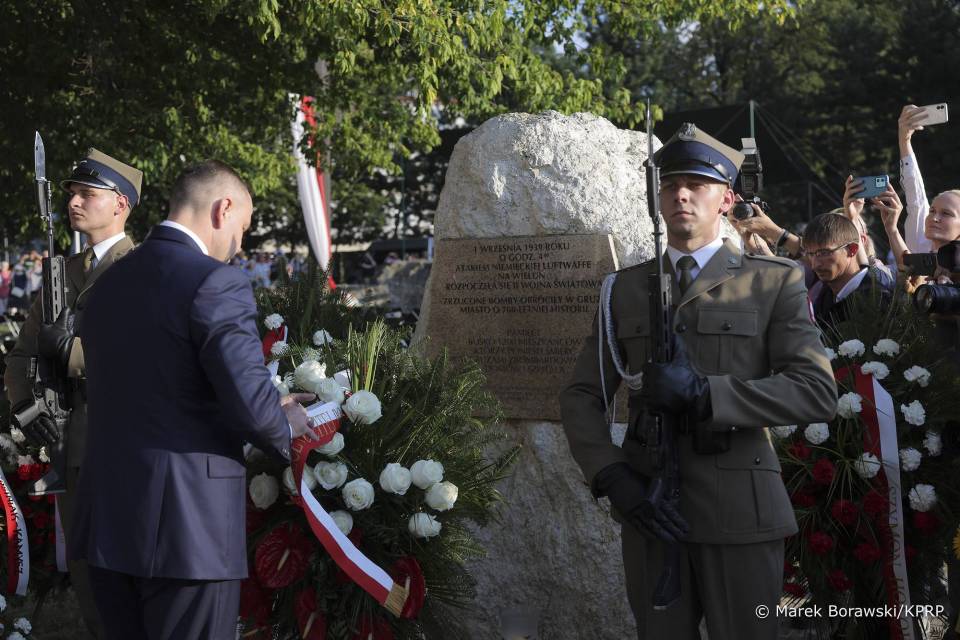 - To, co stało się 1 września 1939 roku jest tak okrutne, przerażające, że trudno w to uwierzyć. 46 ton bomb spadło na Wieluń, na miasto, które było otwarte, miało siedem wieków doświadczenia, budowania swojego potencjału i otwartości, także dla mniejszości narodowych. Mimo, że to miasto nie leżało na strategicznym, militarnym, wojskowym punkcie zainteresowania Wehrmachtu i Niemiec, zostało okrutnie zniszczone. 1200 osób zginęło zamordowanych w niemieckim szale - powiedział w swoim wystąpieniu Karol Nawrocki.