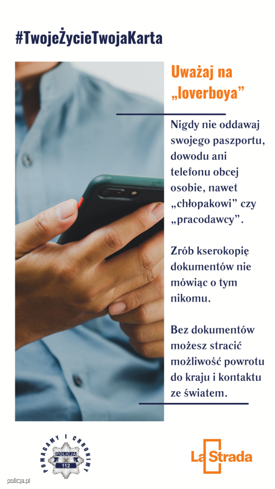 Więcej informacji o kampanii można znaleźć pod hasłem: Rusza kampania #TwojeŻycieTwojaKarta – wspólna akcja Policji i Fundacji La Strada przeciwko handlowi ludźmi.