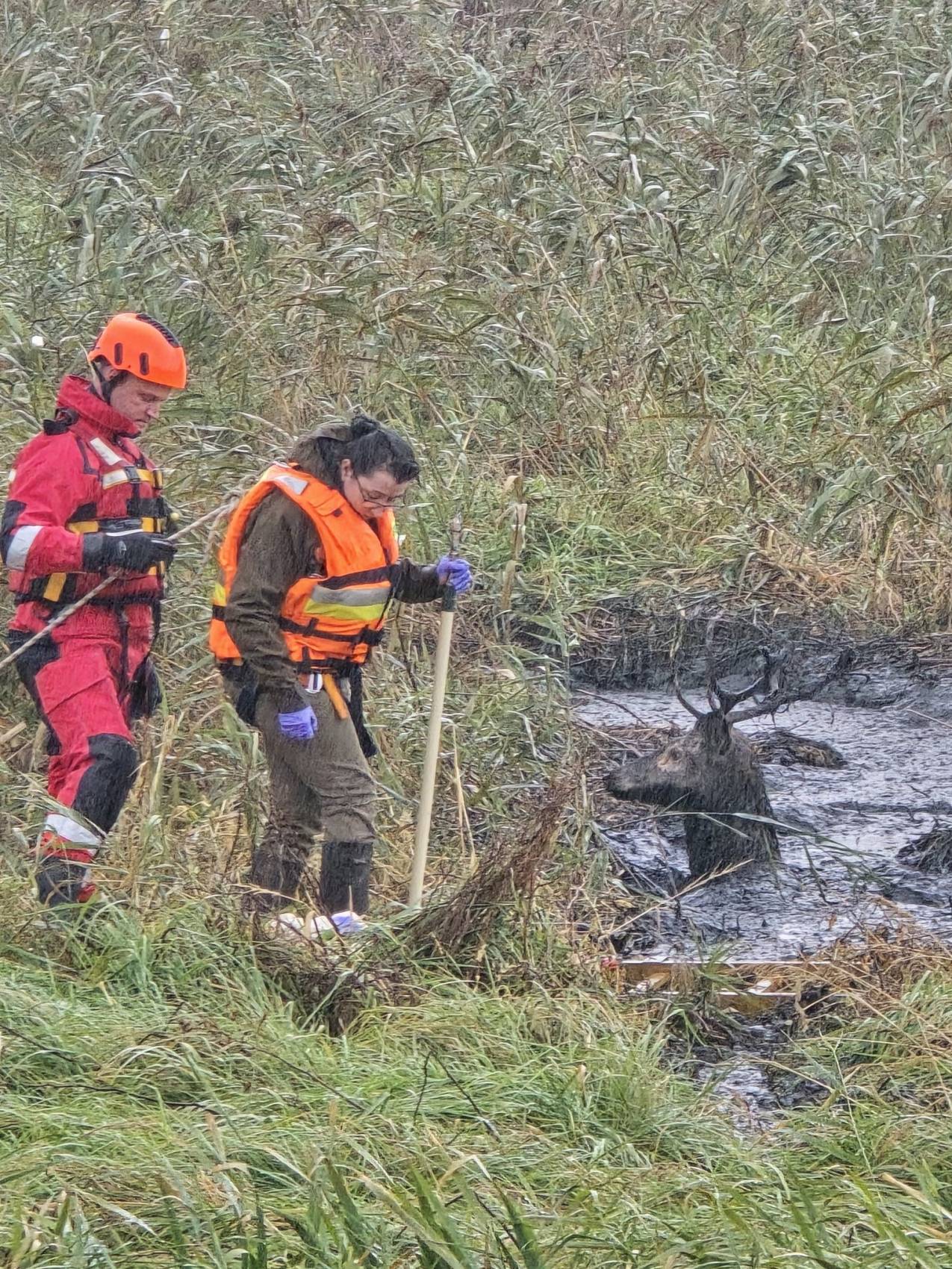 Osiem godzin walki o życie jelenia - poruszająca akcja ratunkowa strażaków, myśliwych i weterynarza [Foto]